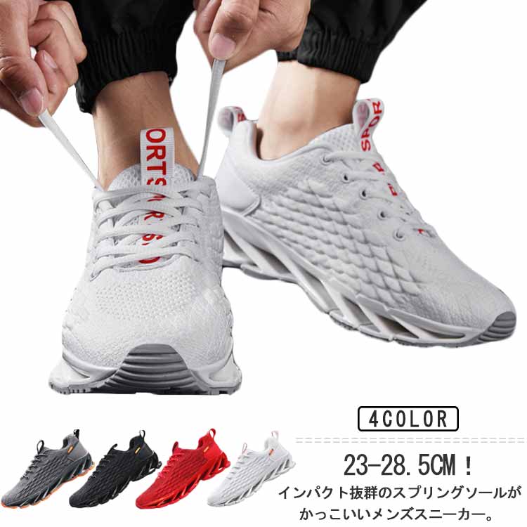 23-28.5cm!インパクト抜群のスプリングソールがかっこいいメンズスニーカー。アッパーはニット素材を採用。伸縮自在で通気性に優れたニット素材は、足の動きにぴったりフィットして歩きやすい。ストリートファッションにハマる、インパクト抜群のスプリングソール。足を組んだ時や、歩いたときに見せるデザイン性の高いソールは、見る者に鮮烈な印象を与える。履いているのを忘れるくらい足が軽い疲れ知らずの軽量デザイ...