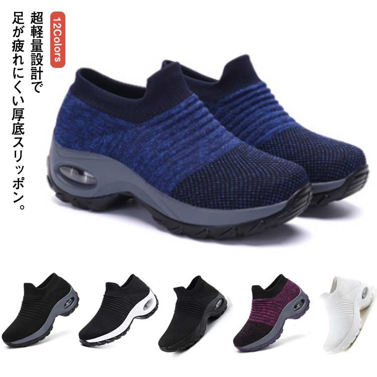 超軽量設計で足が疲れにくい厚底スリッポン。グリップ力のあるソールで悪天候時も滑りにくく安全。通気性のいいアッパーでムレにくい。冬場は暖かく、夏場は熱がこもりにくい。クッション性も良く足に負担がかからない。ニット素材で履き心地◎紐のないスリッポンタイプで着脱が楽。幅が広いので締め付け感がない12種類もの豊富なカラー展開、22.5cm~27cmまでのサイズ選べる。ジムやランニング、ウォーキング、普段着...