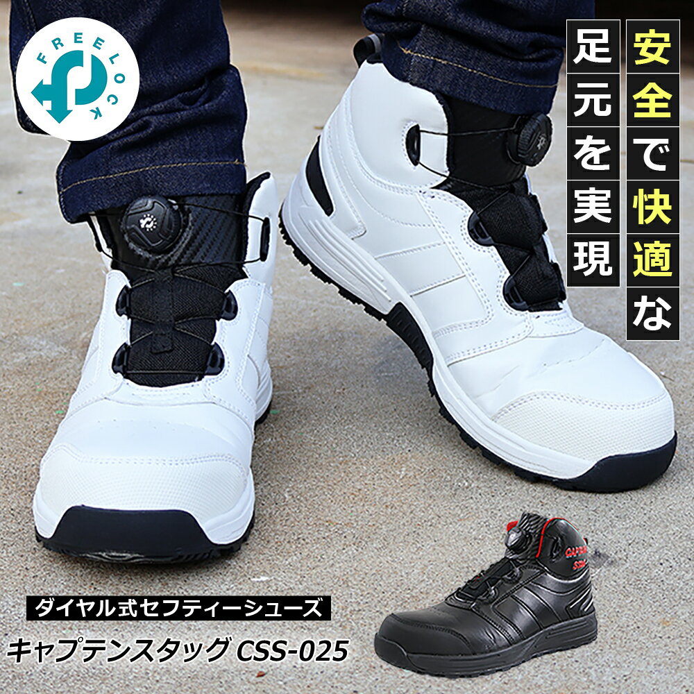キャプテンスタッグCSS-025 商品詳細 ■ミドルカットタイプ ■FREELOCKダイヤルシステムで最適なフィット感を調節 ■鉄製先芯入りで安全 ■滑りにくい耐滑底 ■油で劣化しにくい耐油底 ■EVAカップインソール付きで疲れにくい ■リフレクター(反射材)装備 仕様 ■カラー:ブラック・ホワイト ■サイズ:25.0、25.5、26.0、26.5、27.0、28.0(cm) ■重量:(片足)約4...