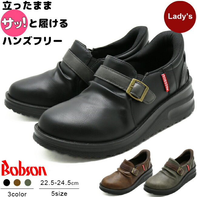 ■Bobson レディース 手を使わずに履ける ハンズフリー シューズ スリッポン スニーカー フェイクレザー 合皮 靴 飾り ベルト サイドゴア サッと履ける スポッと履ける ブラック ブラウン カーキ 立ったまま ボブソン 婦人 高齢者 防災 カジュアル BS-0082