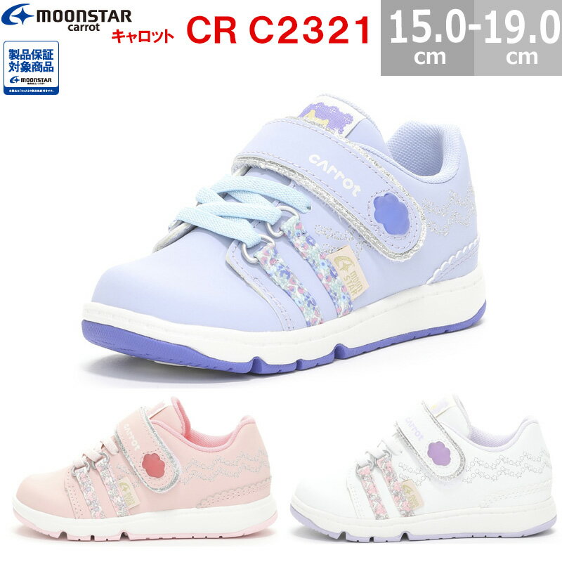 ■スニーカー 女の子 ムーンスター キャロット CR C2321 キッズシューズ 15.0cm-19.0cm 女の子 全3色 パープル ホワイト ピンク Kinarinoco